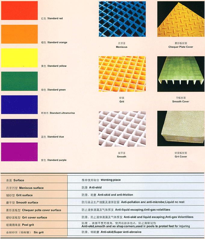 1、耐腐蝕 樹脂性能的不同賦予玻璃鋼不同的耐腐蝕性能,使在不同酸堿、鹽、有機溶劑的氣、液介質的腐蝕環境下長期使用。 2、阻燃 優質的樹脂及阻燃添加劑賦予產品優良的阻燃性能,一般阻燃產品氧指數大于26,火焰擴散系數小于25,煙密度小于500。 3、輕質高強 無堿玻璃纖維紗與樹脂的結合,賦予產品獨特的輕質高強的特性,產品的比重是鋼材的1/4,適用于腐蝕環境下各種承載結構。 4、耐老化 產品由優質的基體樹脂加抗老化添加劑,使產品具有持久的抗老化性能,可保持長久的光澤及持續的高強度,使用壽命在20年以上。 5、可設計性 除玻璃鋼靈活的設計性能外,產品的顏色可以根據客戶的要求進行定制,外形尺寸也可切割拼接成客戶所需的尺寸。 6、安全防滑 高彈性模量及不同的表面效果使格柵具有防滑性能,輕微彈性減少工作人員的疲勞感,雙平面,月牙面,砂面,菱形封面,